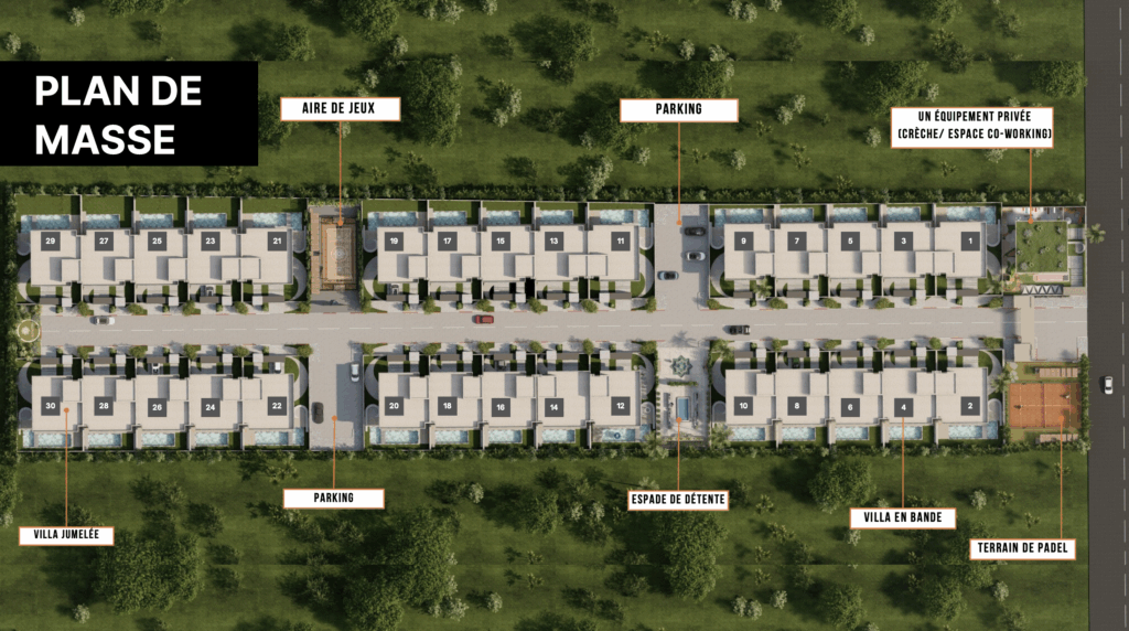 Le projet propose différents formats, notamment des villas jumelées et des villas en bande, conçues pour maximiser le confort et la fonctionnalité tout en conservant une esthétique élégante et intemporelle.